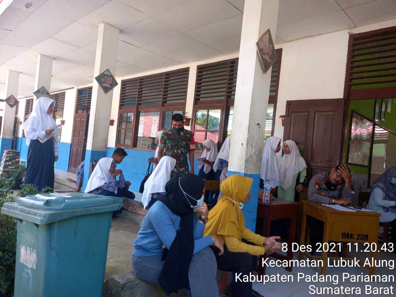 Lubuk Alung– Bintara pembina desa (Babinsa) Koramil 05/Lubuk Alung Praka Zakhi Dan Bhabinkamtibmas Aipda Azri pantau pelaksanaan vaksinasi lanjutan kepada Anak-anak Sekolah SMPN 2 Sikabu Nagari Sikabu , guru, Serta warga di SMPN 2 Nagari Sikabu kecamatan Lubuk Alung, Kab Padang Pariaman.08 Desember.2021